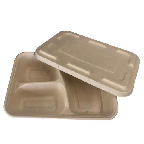 950ml Bagasse 3 Compartment Lunch Box with Lid - 300 sets